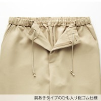 脇後ゴム/両脇ポケット/後ろ右ポケット/ベルトループ付/前ファスナー/ウエストひも入り |