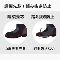 鋼製先芯と踏み抜き防止ステンレス板が足元をしっかりと保護し、安心して作業に集中できます。